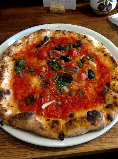 チーズがのっていないピザで、トマトソースにチェリートマト、アンチョビ、オリーブ、ケッパー、ニンニク、オレガノが乗っています。