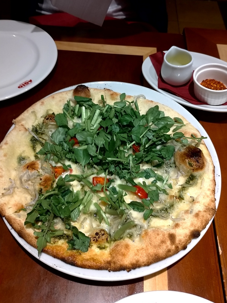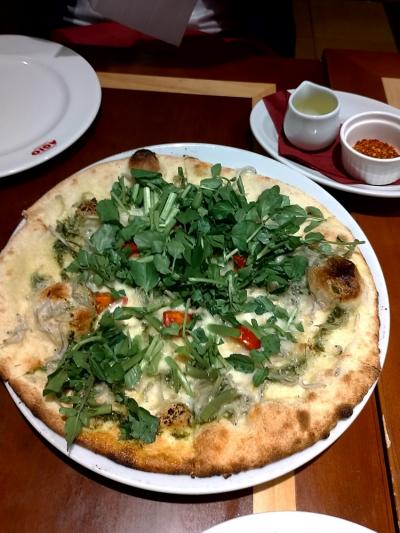 釜揚げシラスとクレソンのピッツァは、クレソンの香りがよく、オレンジのオイルをかけるとまた味が変わっておいしかったです。