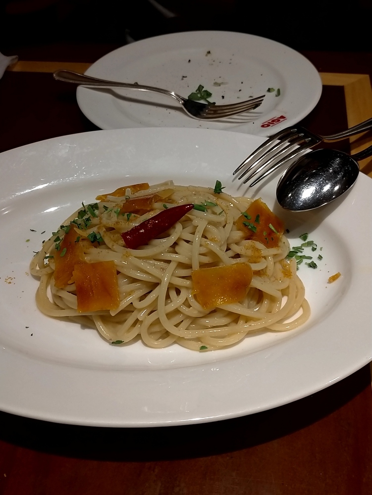 地中海育ちのからすみをつかったスパゲティは、スパゲティよりちょっと太麺で味が濃いめでした。- 旅行時期