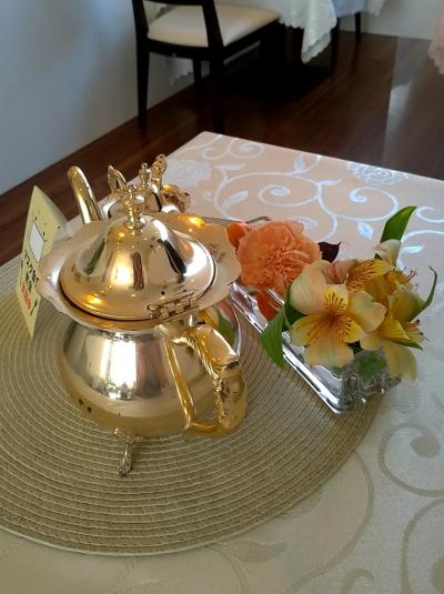 それぞれのテーブルに生花とティーポットがおしゃれにディスプレイされていてかわいらしい雰囲気。