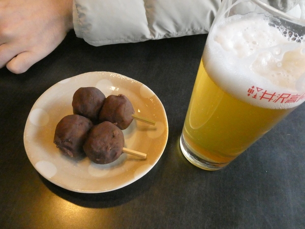 軽井沢ビールにおそば、焼き団子、そば団子をいただきました。
