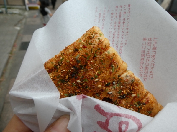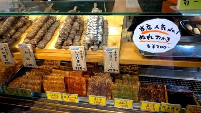 いろんな種類の四角いおかきや、くしに刺さった、焼き鳥のような濡れおかきなど種類も豊富。
