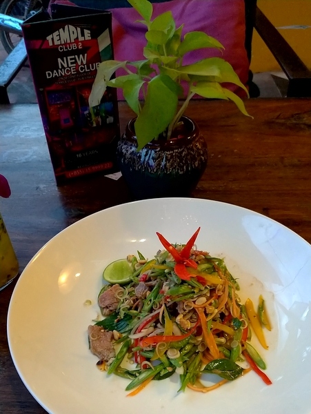 食事は以前カンボジアに来た時においしかった、フレッシュビーフサラダ。