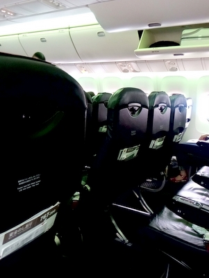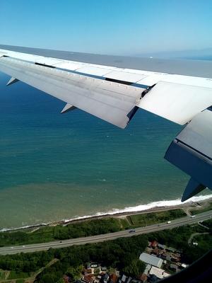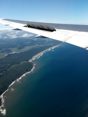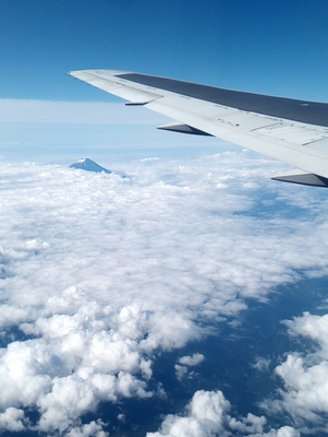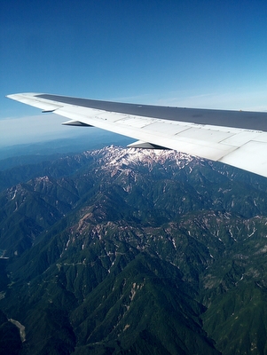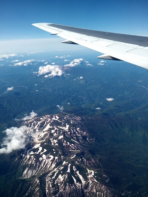 富士山、雪が積もった緑の山々、そしてグラデーションの日本海が見えて1時間弱の飛行機はアトラクションのような楽しさでした。