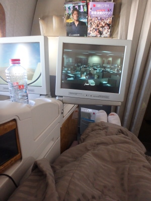ドバイから羽田へは古い機材で、席も狭く同じビジネスと思えないくらい。