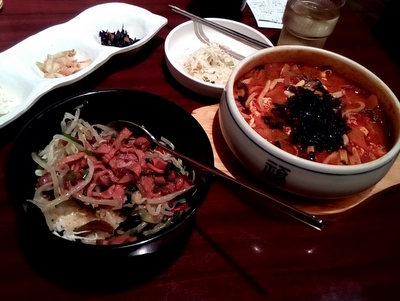 ハーフでもオーダー可能だったので、ローストビーフのユッケ丼と、ユッケジャンうどんで。