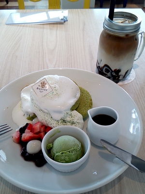 季節限定のパンケーキ、ふわふわ白玉抹茶とドリンクにゼリーエスプレッソを。