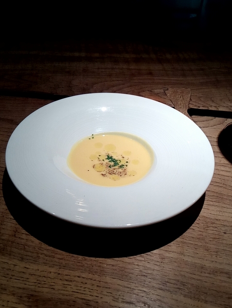 まずはキャロットスープですがおいしいんだけどびっくりするくらい、底が浅い器で何ほども入っていませんでした。