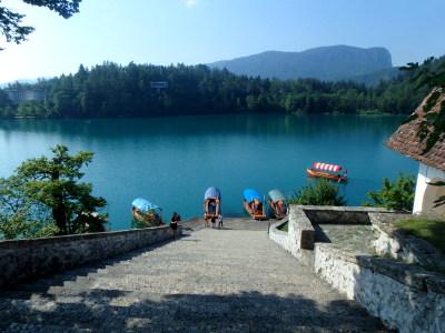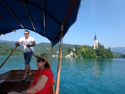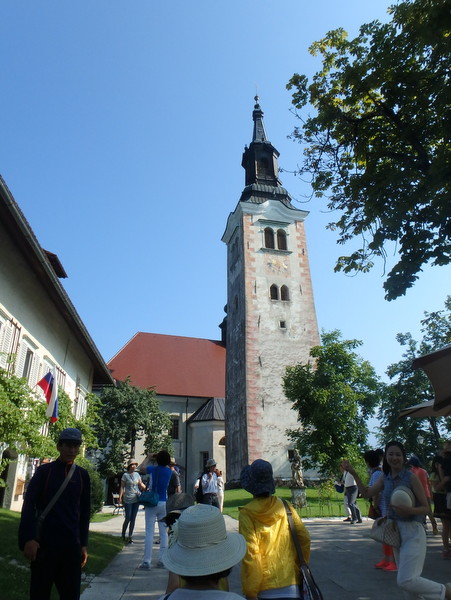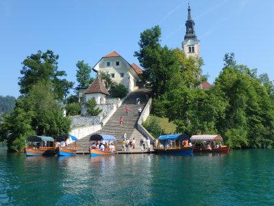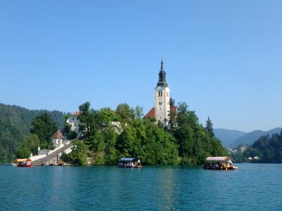 ブレッド湖の真ん中にぽつんと浮かぶ小さな島に立つ教会。