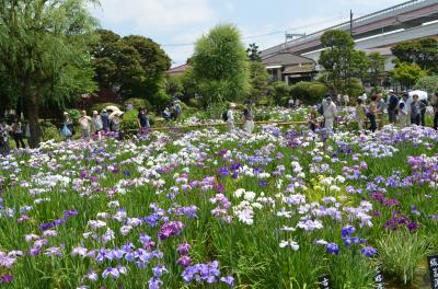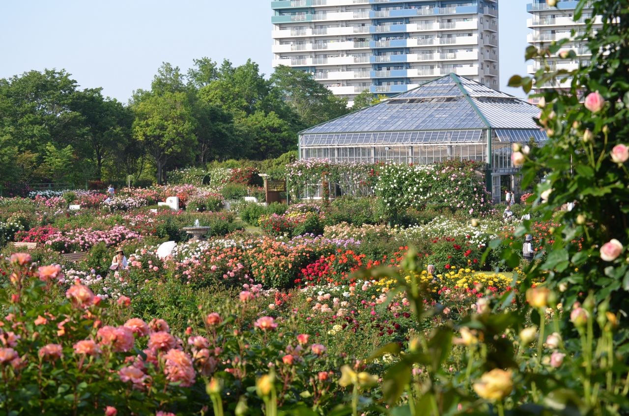 大きな整形式庭園はフランス様式の庭園でモダンローズを中心に展示している