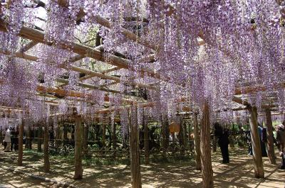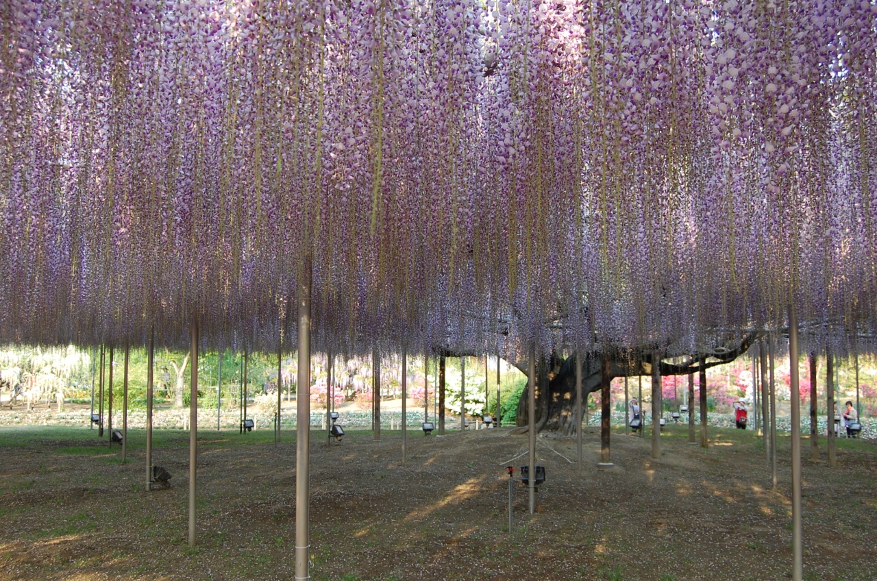 この大藤は、平成8年2月、大藤棚の4本が足利市朝倉町から20kmもの移送の上、現迫間町に植栽された。移送についての大藤物語は絵本になって売っている。 そして10年の歳月が流れ、 10年前72?の藤棚も10倍以上の900?にも拡がり、世界一美しい藤と言われるほどになった。 夜はライトアップされて、美しく幻想的な世界を醸しだす。