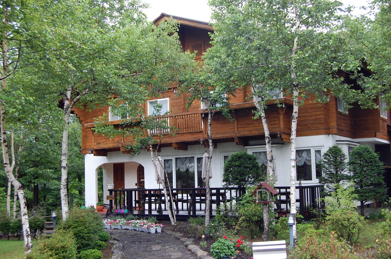 女神湖の畔のペンションで、木立の中に美しい外観を見せている。