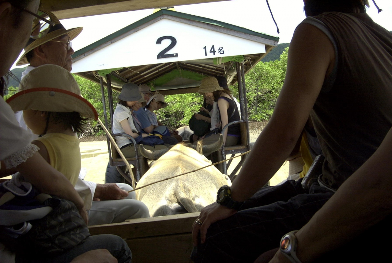由布島は島の周囲約2.1Km、海抜1.5mという小さな島で、西表島から400メートル。遠浅の海は水牛車で渡れる。水牛車に乗って由布島へのんびりのんびり渡るのが良い。御者が三線を弾いて沖縄民謡を謡いながら行く。時間が進むのが遅いのが気持ち良い。