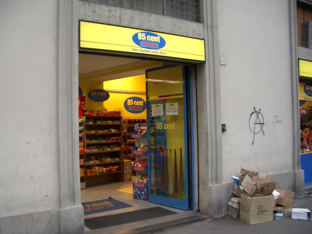 イタリアのフィレンツエをぶらぶらしていたら、なんと100均ショップが有った。「85 cent Shop」の看板が有り、レートが129.8円/€なので、円換算で110円に成った。どちらが本家なのだろうか。