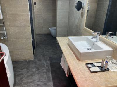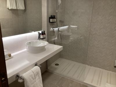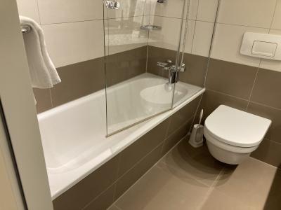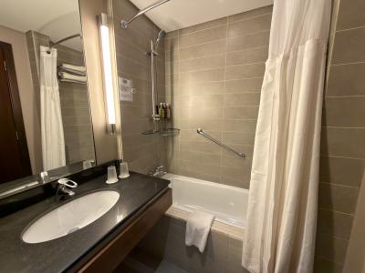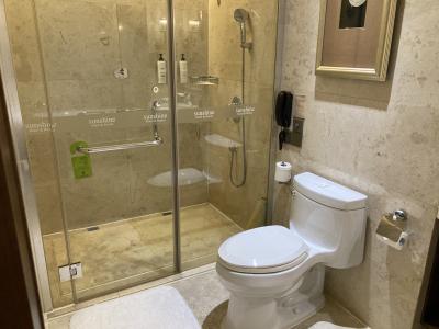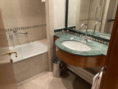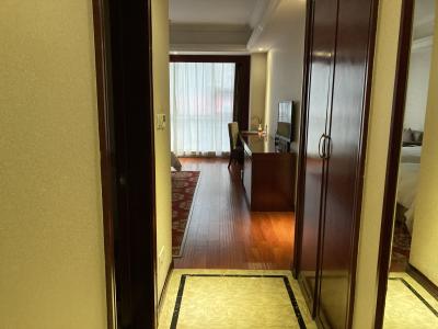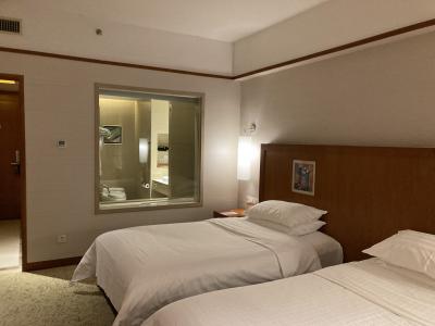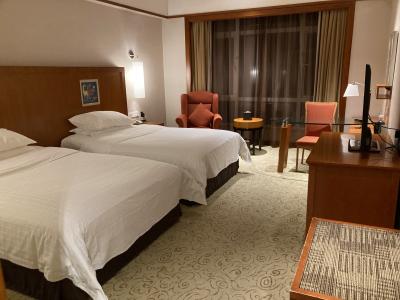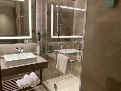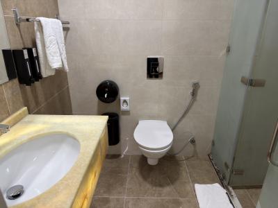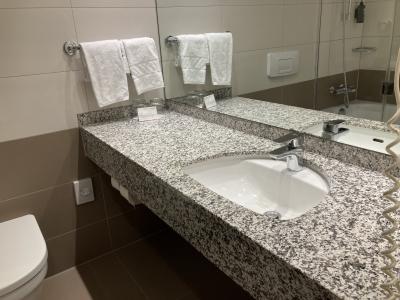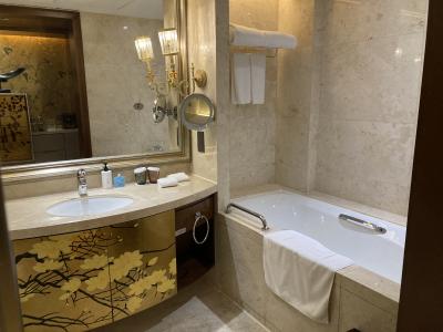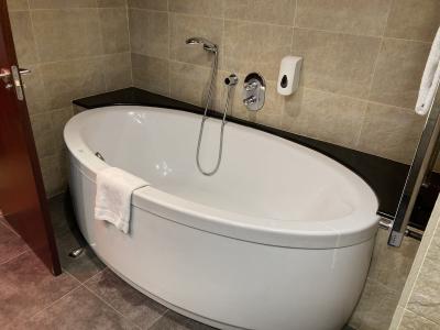 部屋は広く水も4本ついていました。バスタブ付の部屋もあるようですが、割り当てられませんでした。バスローブは付いていません。