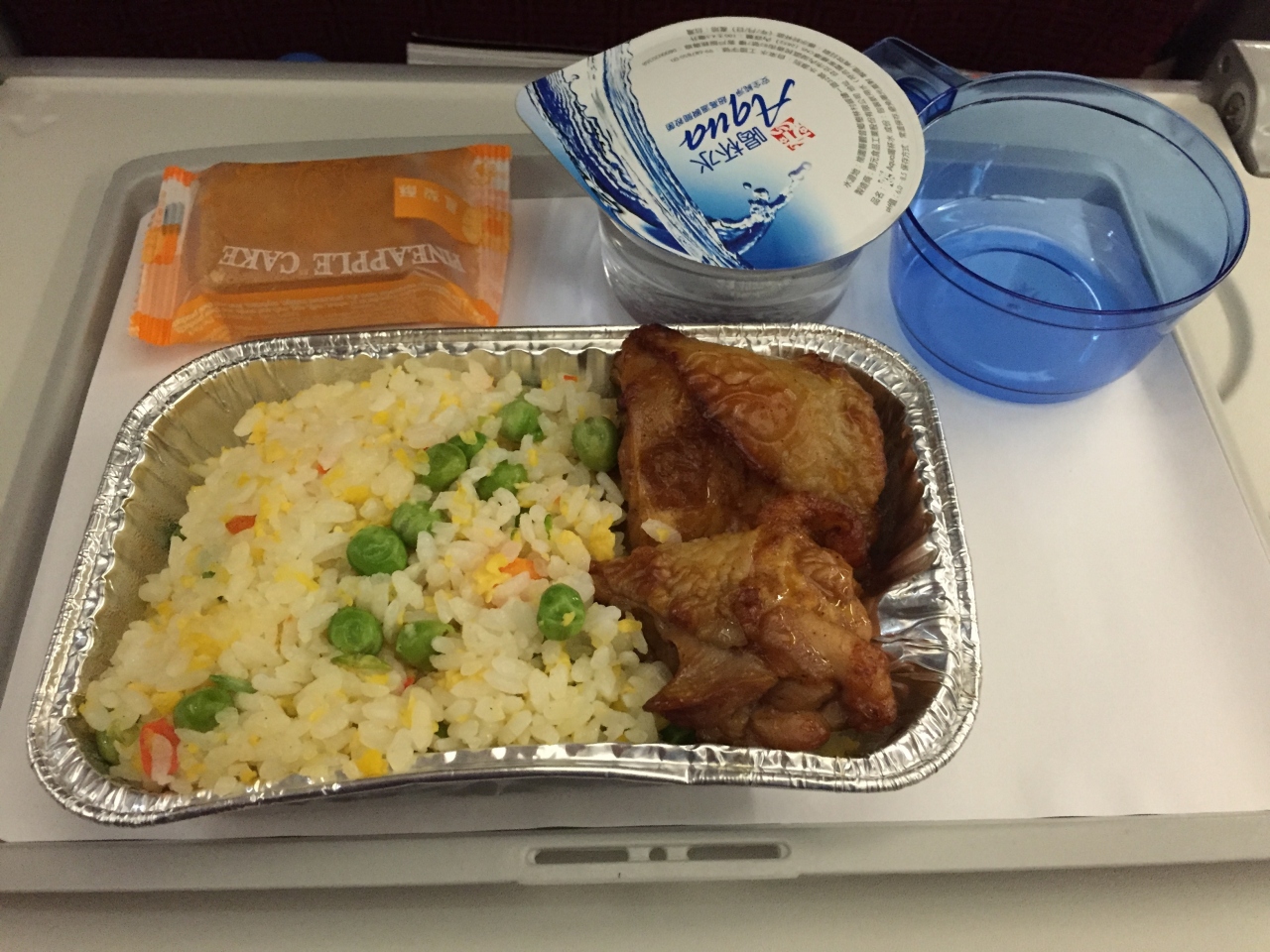 香港と台北桃園航空の往復で利用。海南航空の子会社ですが、同じく子会社である香港エクスプレスとは異なりレガシーキャリアとして機内食も提供されます。香港から台北に向かう便ではソーセージパンの提供でしたが、台北から香港に向かう夜20時台桃園発の便ではチャーハンに鶏の唐揚げがついた機内食が出ました。