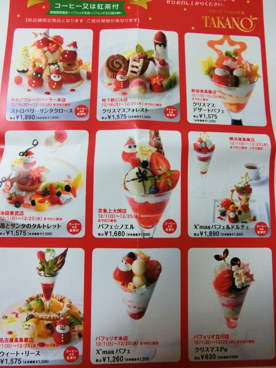 タカノフルーツパーラーではクリスマス限定スイーツが店舗により異なるということで、他店の限定メニューのチラシももらいましたが、どこのお店のものもめちゃくちゃ可愛い♪