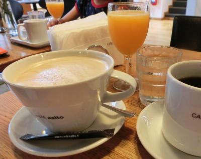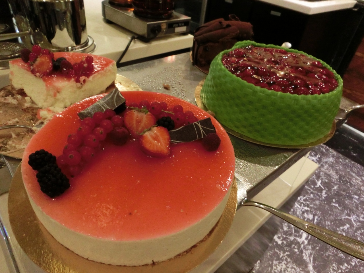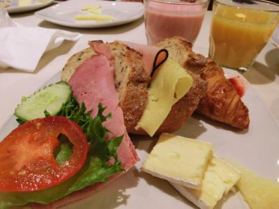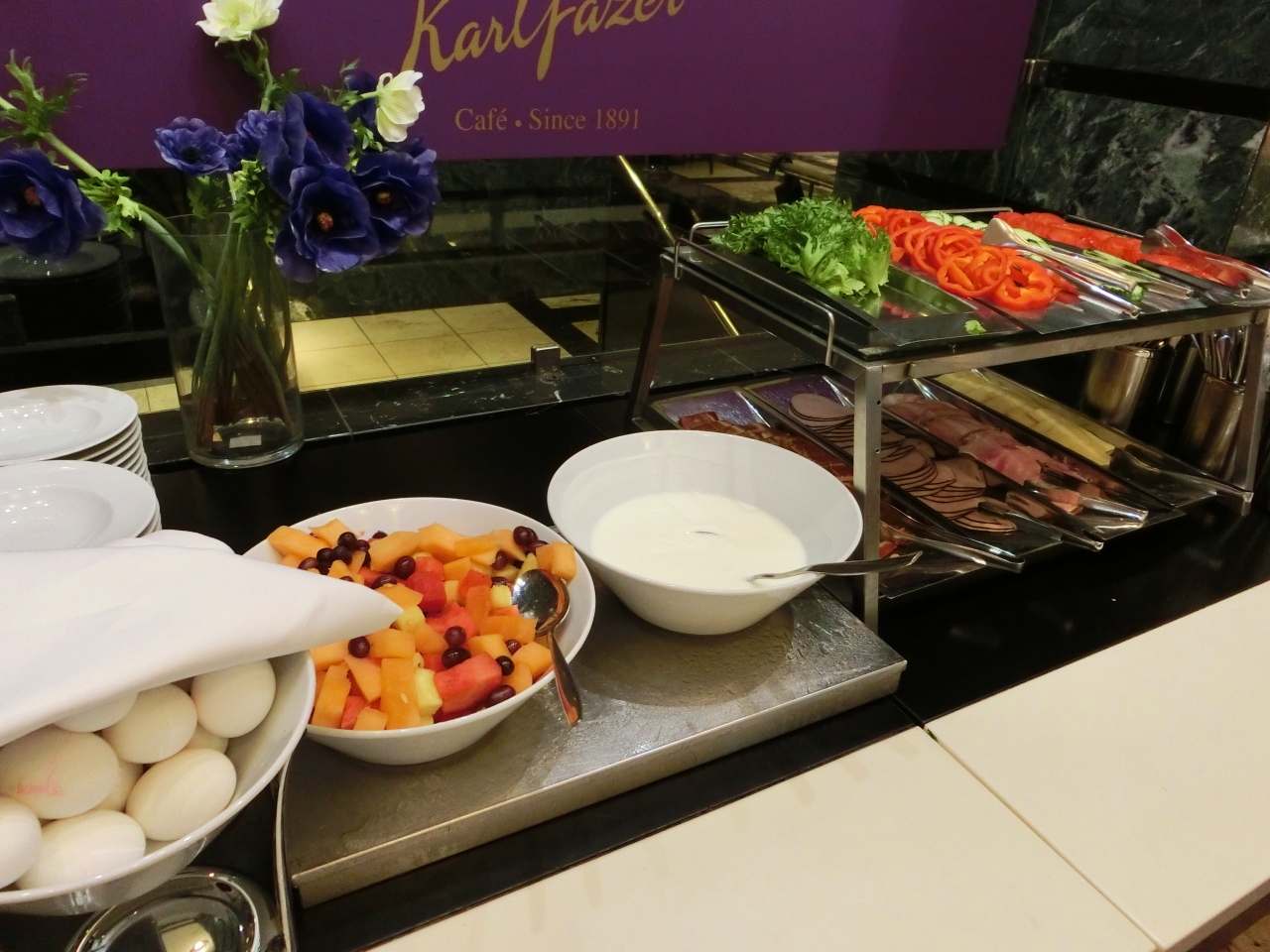 チーズにパン、ハム、サーモン、サラダ、卵にヨーグルト、果物の朝食をたっぷり楽しみ、デザートはFazerのケーキも頂けます♪