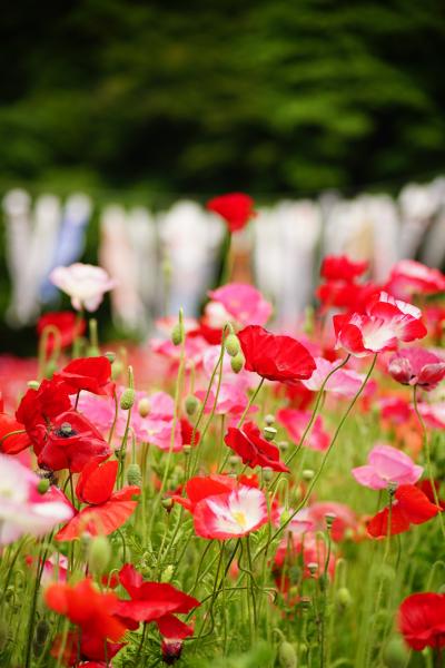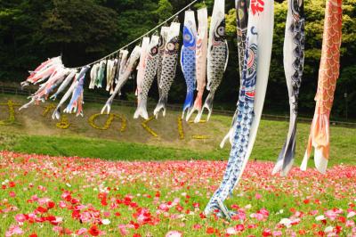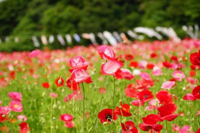 例年、4月~6月初めまでおこなわれるポピーまつり。特に5月に入ったGW頃からは赤や白のシャーレーポピーが一面に咲きみだれる。また、こどもの日に因み沢山のこいのぼりが花畑の上を気持ち良さそうに泳ぐ様子も見られる。