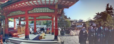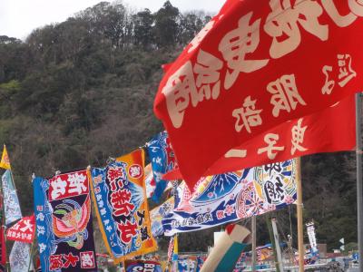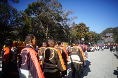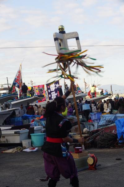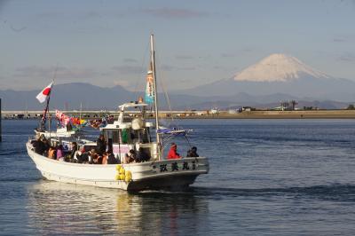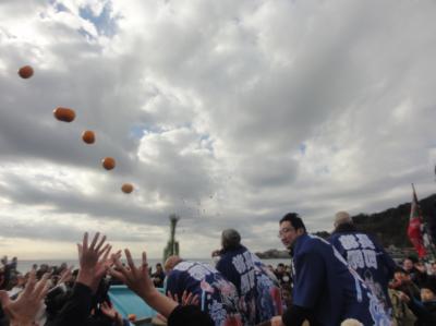 毎年1月4日、午前8時過ぎから鎌倉の腰越漁港では、漁師さんの新年行事”船祝い”が行われる。まず、まず、腰越漁港入り口近くでは相州神童太鼓の演武が始まる。その後、大漁旗や五色の吹き流しが立てられた各船に移り、船祝い(みかん撒き)が行われる。みかんは黄金色に似ているため、黄金が1年間の漁によって返ってくるようにという願いが込められているとのこと。みかん撒きが終わると、初船出が行われ、運が良ければ船に乗船させていただくこともできる。