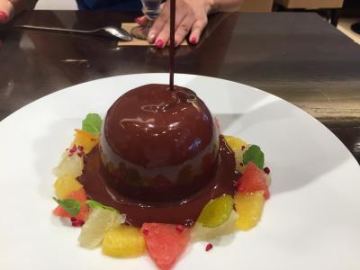 ドーム型のチョコレートに熱々のチョコレートソースをかける演出がたまらない。