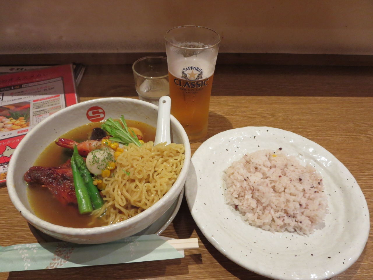 味は和風のあっさり味、野菜、魚介、チキンと具材がたくさん入っていていろんなうまみが出ていてとても女性好みの味だと思いました。トッピングのラーメンはすごくスープにマッチしていて美味しかったです。食べなれないとスープカレーのご飯の食べ方ってちょっと悩んでしまいますね。ご飯不要、ラーメンだけでもよかったくらいです。- 旅行時期