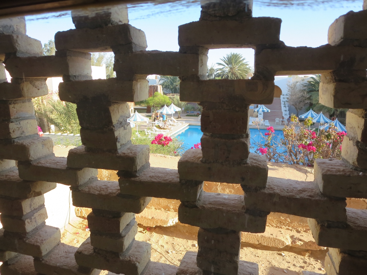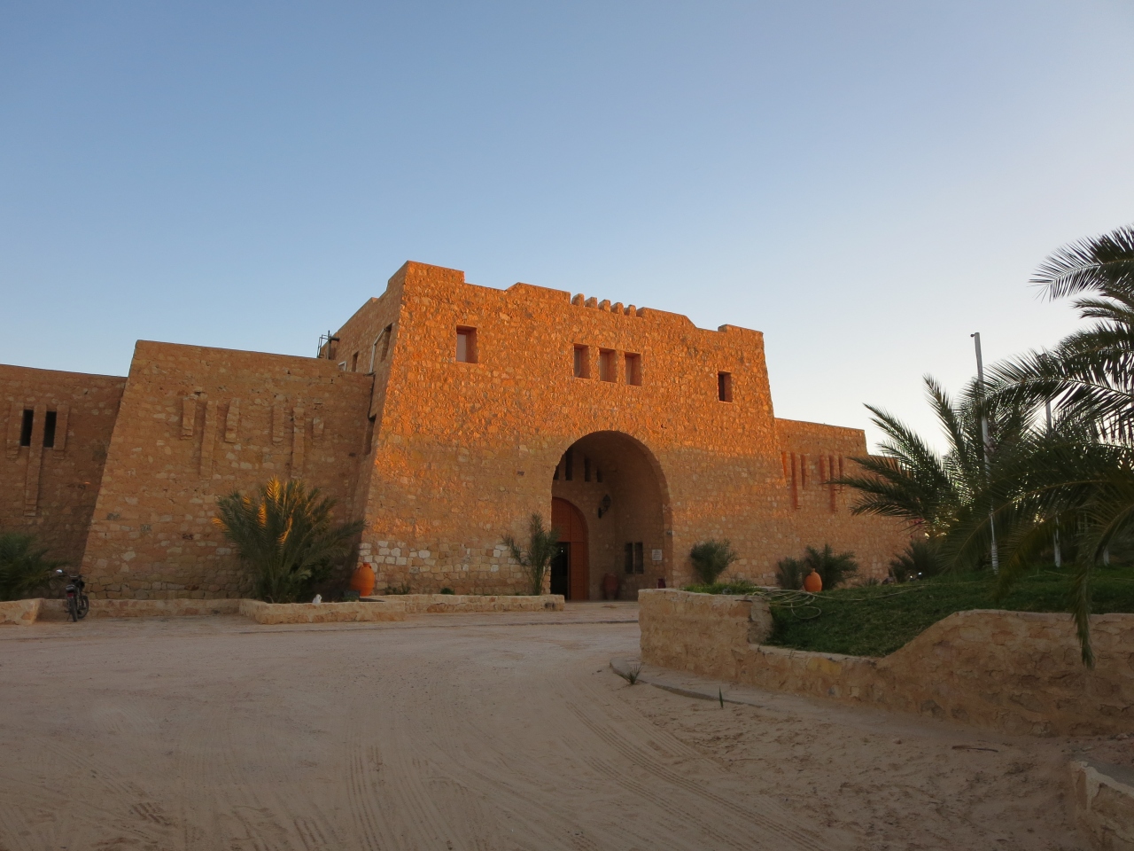 ツアーでの利用。サハラ砂漠の入り口近くのホテル。周りにはナツメヤシの木が生い茂り門構えからして砂漠色の日干し煉瓦製の独特な雰囲気のあるホテルです。