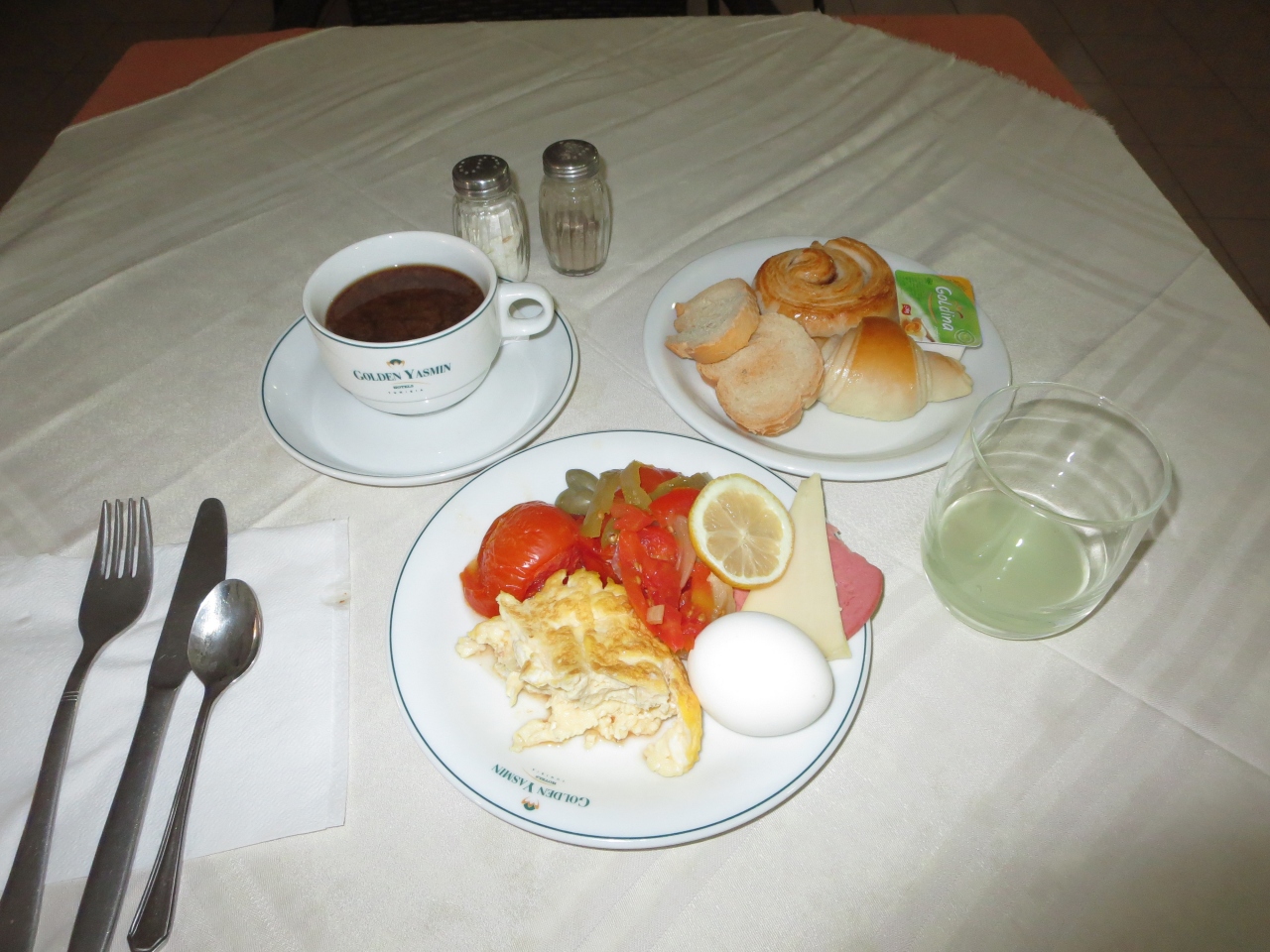 朝食は、オムレツなど頼むと焼いてくれるがよかったです。アラビアンな揚げパンなどもありなかなか充実メニューでした。- 旅行時期