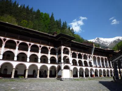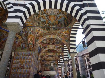 2色の縞模様が印象的な外観。山奥に位置しているため5月でもかなり肌寒いとの話を聞いていましたが、お天気に恵まれたせいかそれほどでもありませんでした。よく写真で見かけるのは縞模様の寺院のほうだけですが、宿坊になっている周りの建物が結構な規模で山をバックによって素敵な景観となっています。寺院の壁、天井を埋尽くすほどのフレスコ画はほんと素晴らしいの一言!なお、敷地内に簡易のようですが、郵便局もあり切手はそこで購入できます。が、切手の値段は物価に比較するとかなり高めでした。もちろんポストもありましたのでその場で記入して投函することができますよ。