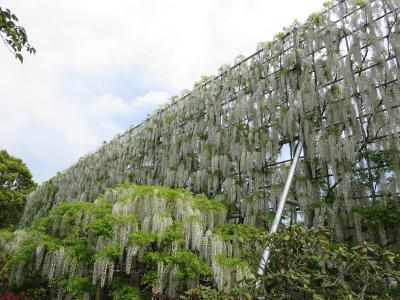 パーク内ですが、入口からすごい人・人・人。外国人(特に東南アジア系)観光客が多いのにも驚きました。ちょうど満開の時期とGWが重なったせいもあり、大賑わいでした。確かに、世界一の藤棚は本当に素晴らしい!!幻想的な薄紫のカーテンと甘い香りの世界にはもう「うっとり」でした。藤の花も、紫や白以外にピンクや黄色、あと花の形状が違うものがあったりして本当に見ごたえがあります。藤だけではなく、つつじや鉄線などなど…いろんな種類の花もありました。