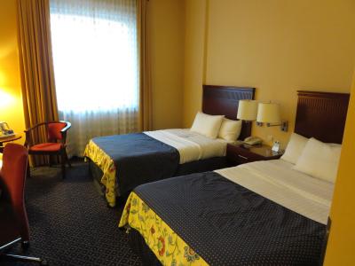 ツアーでの利用。五つ星ホテルとの触れ込みでしたが、老朽化がかなりで設備的にはかなり不安な点がおおいとの添乗員さんの話でした。しかしながら、確かに老朽化はしていましたが、客室は広く、設備も必要なものは揃っているし、海外ではめずらしく歯ブラシもあったりとアメニティーも充実していました。ダブルルームのシングル利用でしたが、無料のミネラルウォーターが客室に2本の他に、バスルームにも1本ついていて、歯磨きにも利用させていただきました。このサービスはなかなか好評化でした。