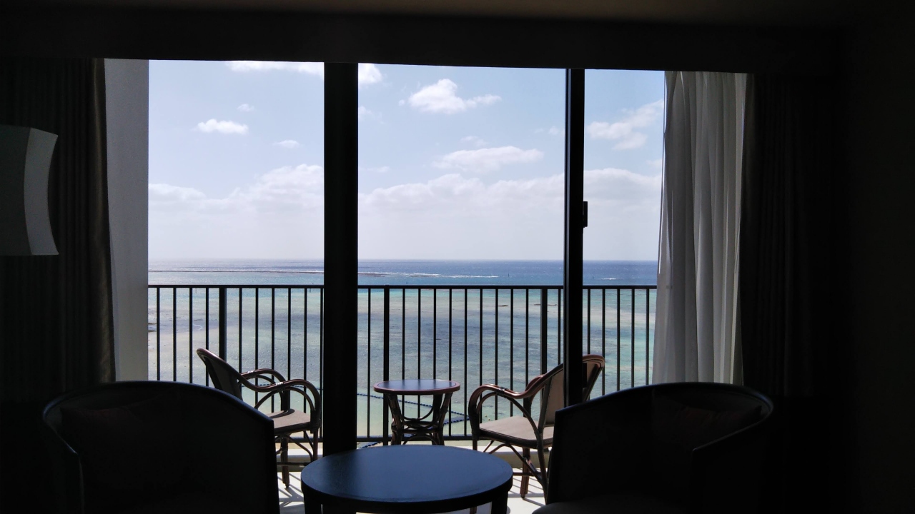ラナイにもテーブルセットがあり、寛いだ空間でビーチやプール、那覇空港を発着する飛行機が眺められる。