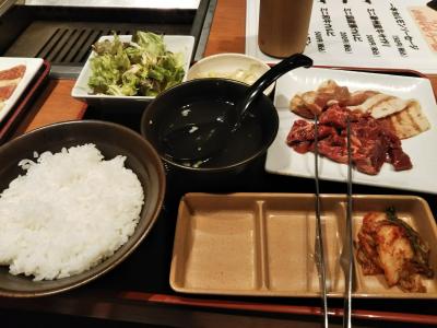 ご飯、スープ、キムチ、モヤシ、お肉2種盛。