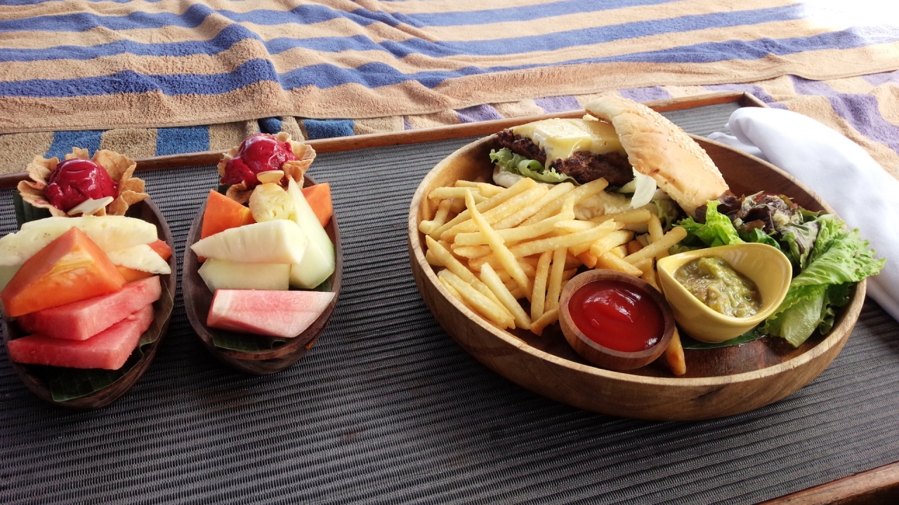 フルーツ&アイスクリームプレートや、wifi も付くし、スタッフを呼べるベルももらえて、フカフカでプライベートエリアが広いガセボで youtube 聞きながら必要に応じて食べ物頼んだりしながら快適に過ごせて、すごくお得。