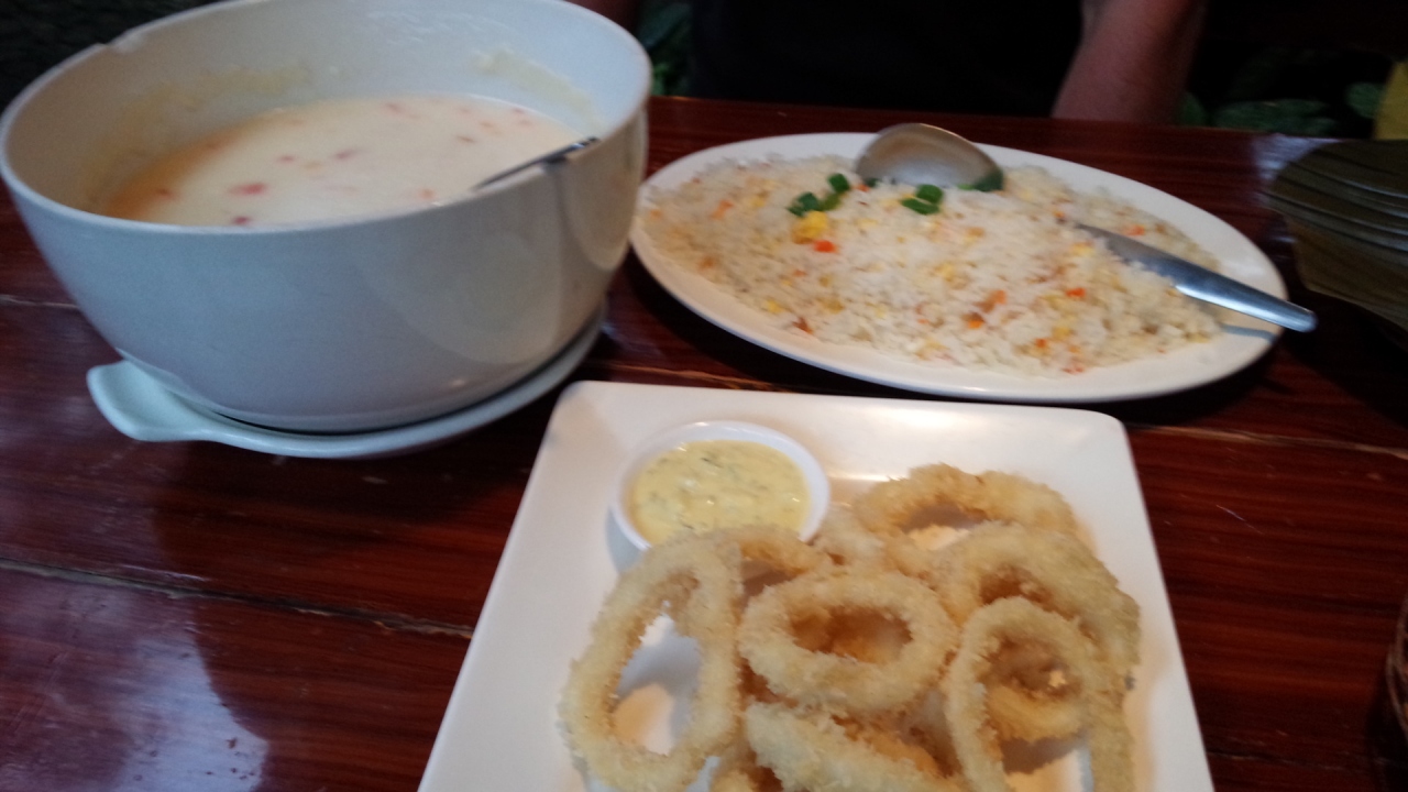 写真に写ってるクラムチャウダーとマリバゴライス、オニオンフライ(だと思ってたら実際はイカフライだった)、