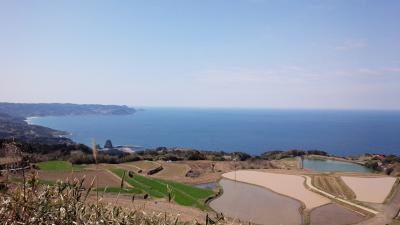 高台に3台くらい停められる駐車場があり、海を背景に、棚田が広がるというダイナミックな風景が楽しめる。