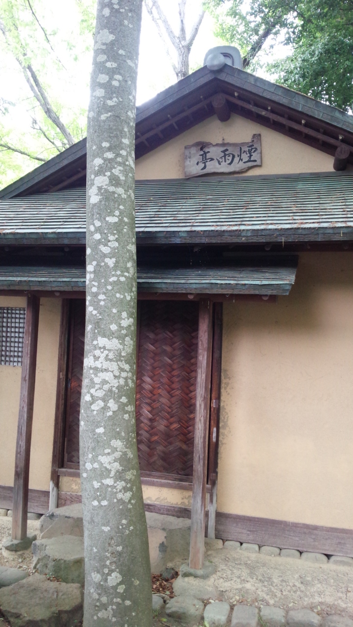 しかし正面から写真を撮ろうとすると入口真ん前に生えてる木が邪魔。茶室ってそういうものなのかな。