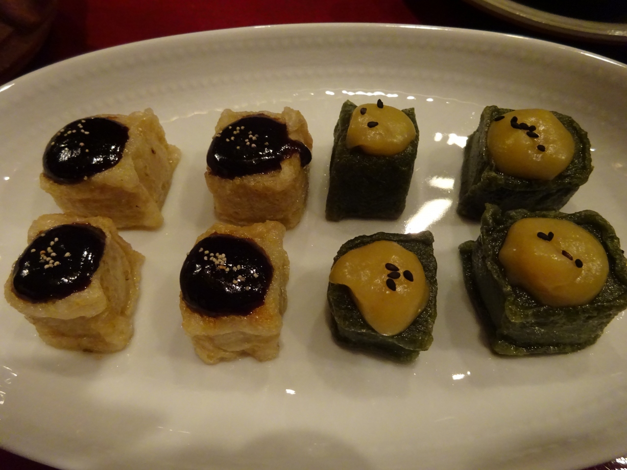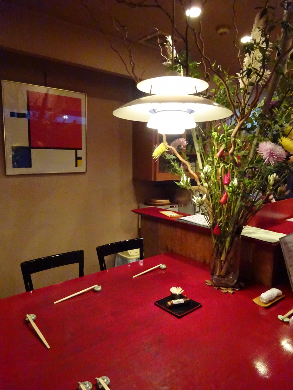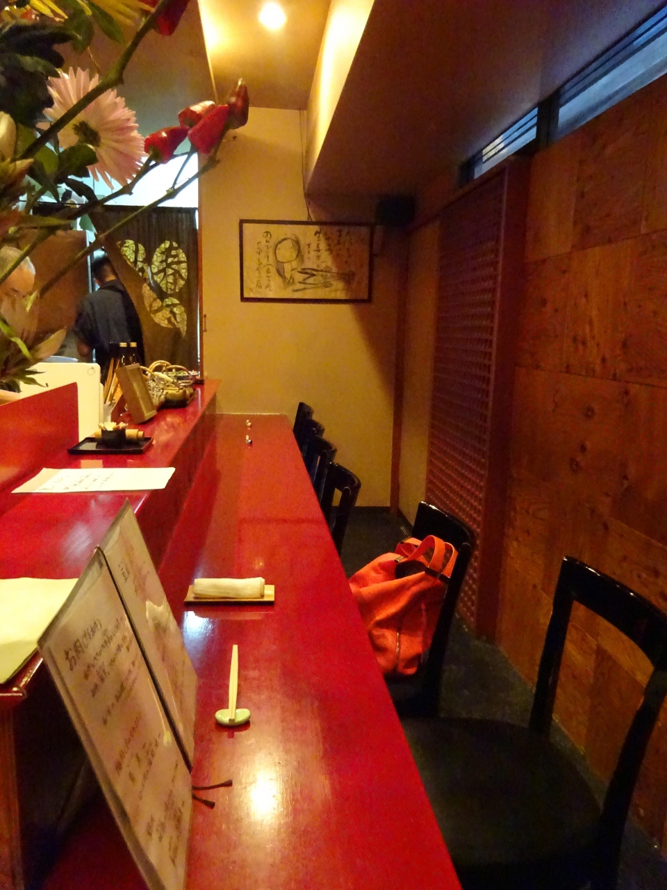 六角高倉西北に大人の隠れ家的なお店があります。おばんざいとも京料理とも言い難い料理でしょうか。厳選された材料と丁寧に作られたお料理は見た目も楽しませてくれますし、優しいお味です。店内はカウンターだけですが、5~6人ならカウンター角の席がお勧めです。朱のカウンターに黒の椅子はセンス良く、いつも季節の花が生けられ雅感があります。カップルや友人とお料理とお酒が楽しめるお店です。