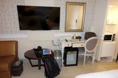 部屋も広くて、大きい事務机が有り豪華な部屋でした。長椅子の他にコーナーソファもありました。室内の設備は文句がなく一流でした。バス・トイレも清潔で大きくゆったりとしています。一番ビックリしたのはテレビが付いていて、見るとDear MS・・・・と妻の名前が表示されていて歓迎のメッセージが書いてありました。TVに固有名詞付きの御挨拶があるのを見たのは初めてでした。
