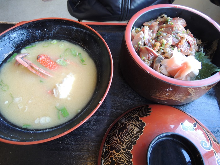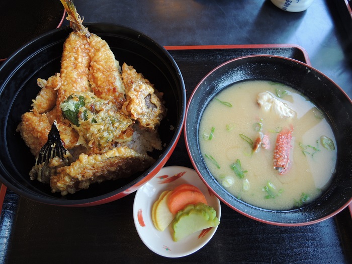 私は天丼で彼は海鮮丼。どちらもあら汁が付いてきました。