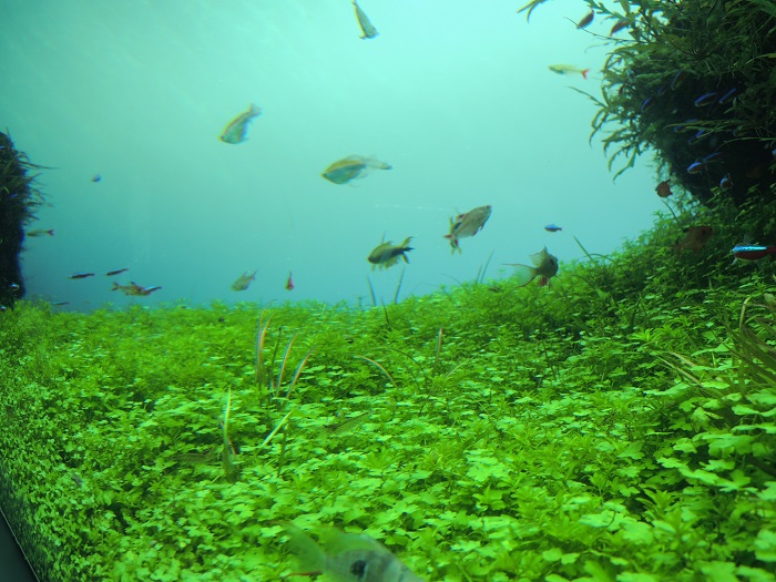 床や壁が木材で水槽の中も光と水草が綺麗です。