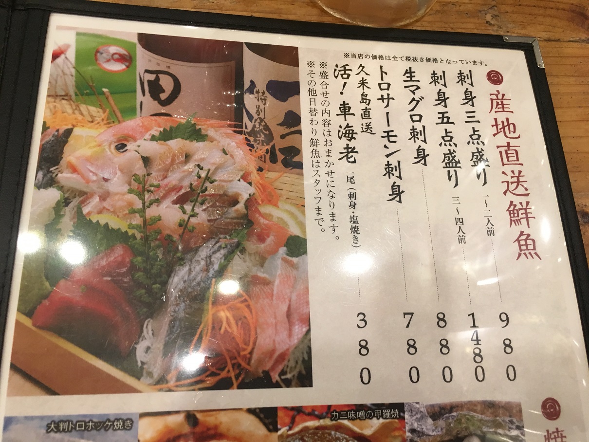 店名を見るとわかるように、魚料理をウリにしているようです。店内には、たくさんの水槽があり、たくさんの魚介類が目に見れました。