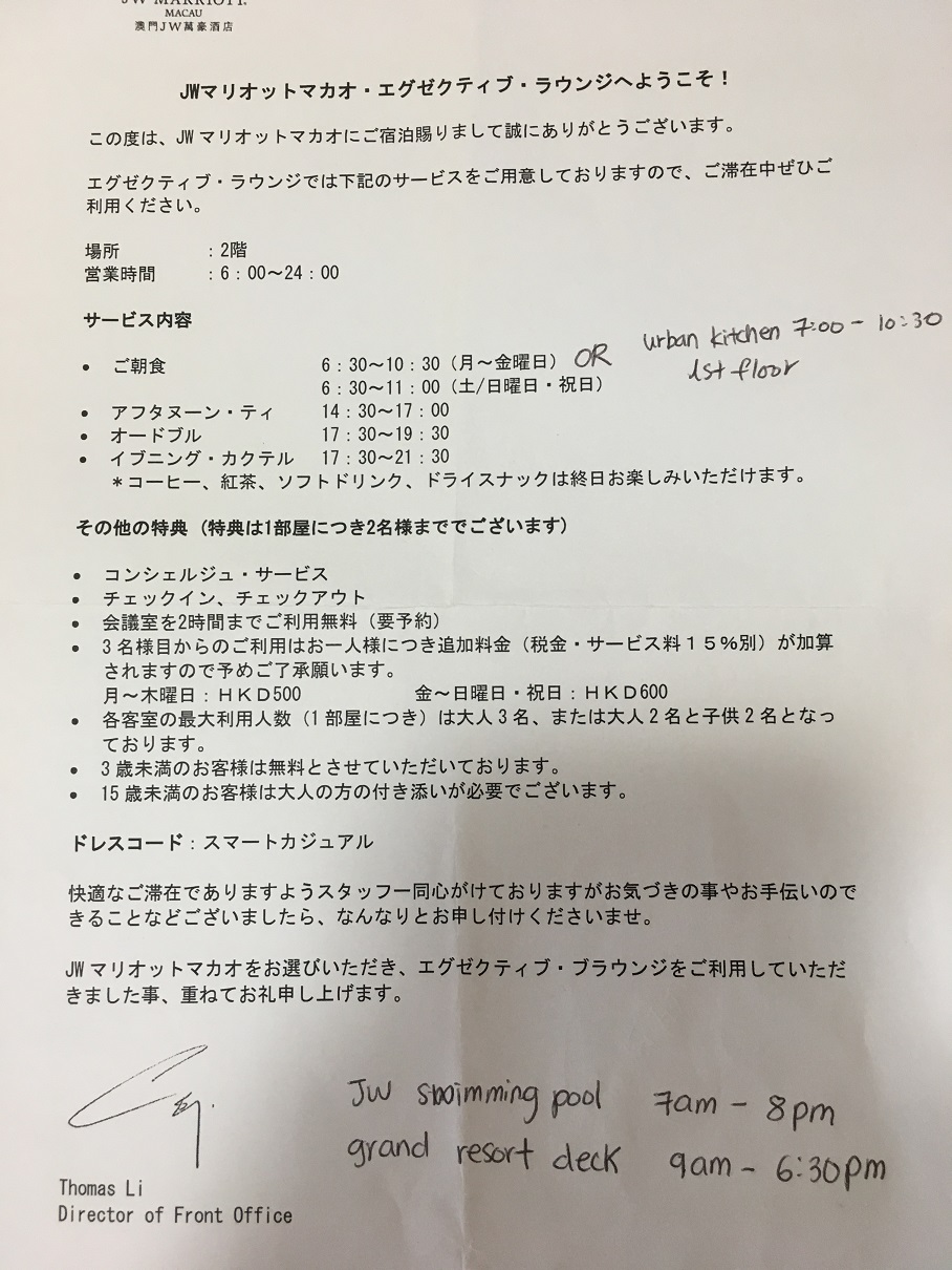 今回のマカオ旅行は、いろんな方の口コミを参考にした結果、私がSPGゴールド会員なのでラウンジでチェックインができるSPG系列のホテルを利用することにしました。