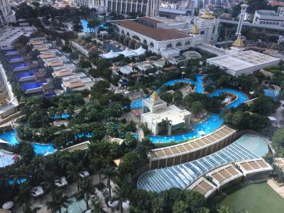 前回マカオに来たときは、フォーシーズンズへ泊ったのですが、今回は子供も少し泳ぎがうまくなったので、ギャラクシーのプールで遊ばせたくて2泊を当ホテル、1泊をお隣のリッツカールトン、最終泊をシェラトンと泊まり歩きました。