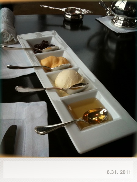 スコーンにはイチゴジャム、パッションフルーツのカスタードクリーム、クロテッドクリーム、アカシアのハチミツがありました。