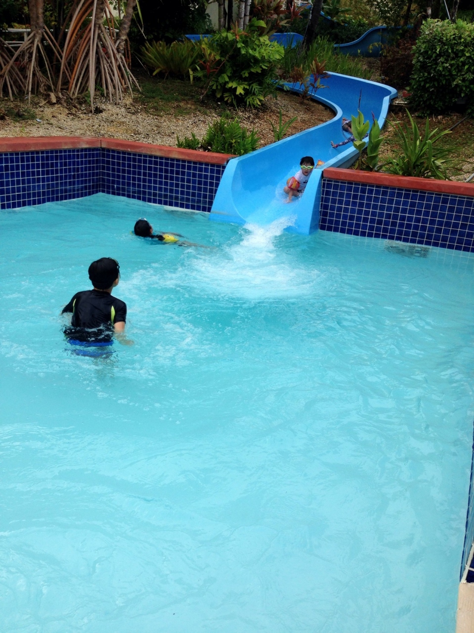 プールには長いスライダーがあり、子供は何回も滑っていました。