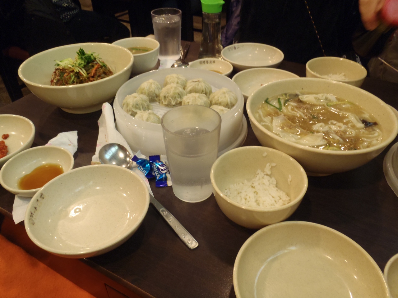 明洞に数店舗ありますが、昼時や夕食時になると、かなりの行列ができているので、時間を少し外して行きました。多少の行列があっても、回転は早いです。席はやや狭いですが、不潔な感じはありませんでした。座ると注文を聞かれ、お金は前払いで払います。ハシやスプーンは、引き出しに入っていて自分で出します。キムチは辛いけどおいしくて、テーブルの上の容器から好きなだけ食べられます。水はときどき足しに来てくれます。マンドゥも、数種類ある麺類も、安くておいしかったです。辛いのが苦手な人でなければ、お薦めできる店です。
