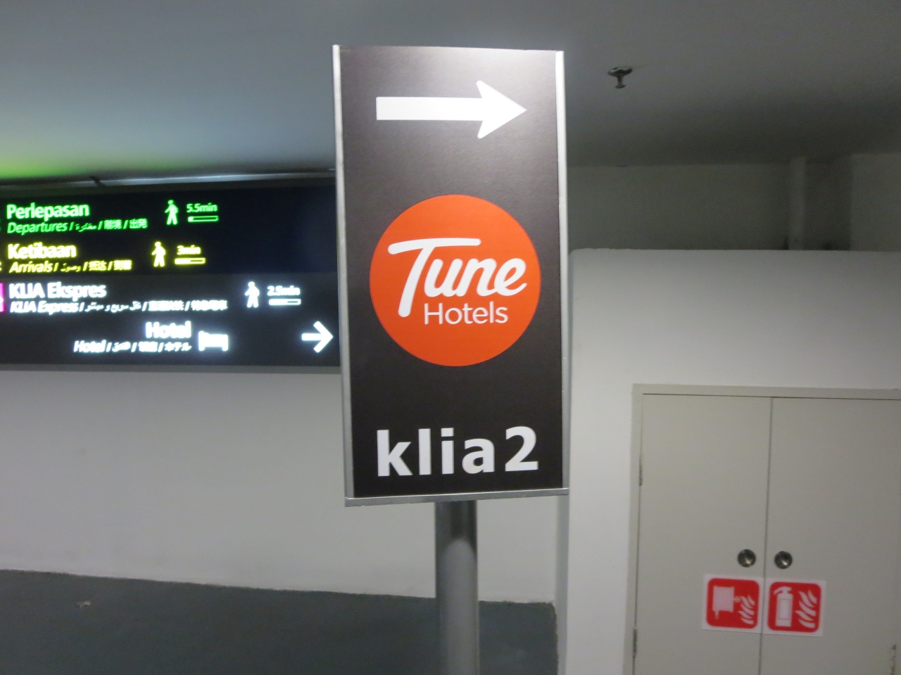 Klia2の到着口からバス乗り場のほうへずっと進んでいくと、下に降りるエスカレーターがあります。その案内板でL1Mでベッドマークがついていますが、それがチューンホテルです。L1Mまで下りれば、正面にチューンホテルのロゴがあるのであとは、案内に従えばOKです。