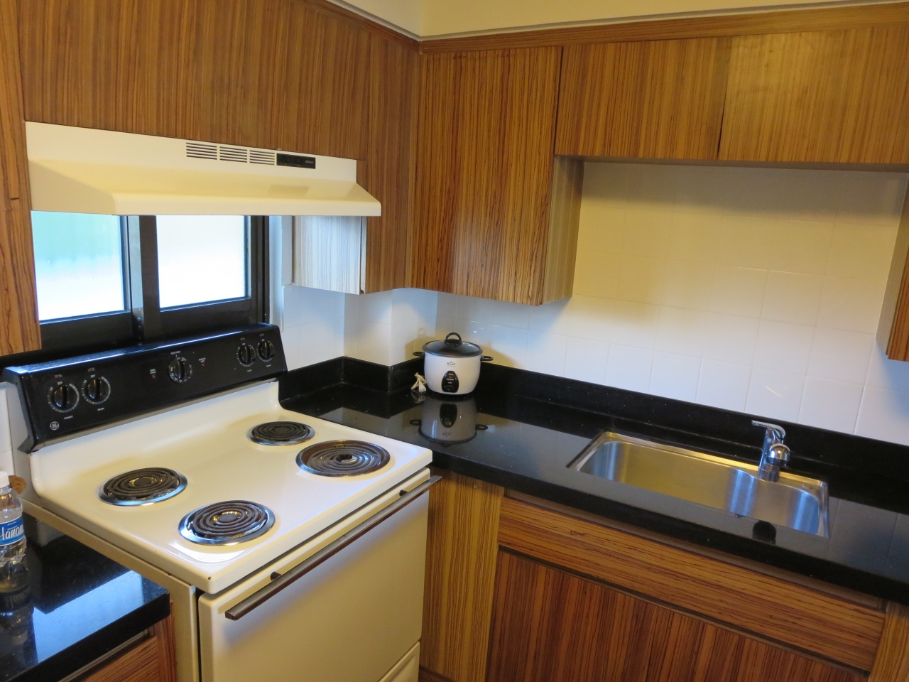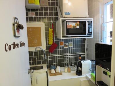 キッチンの設備は必要最小限ですが、鍋、食器類はちょっと少な目です。もう少し種類と数があってもいいと思いました。また、布巾が全然なかったので不便でした。
