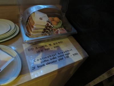 フロント前には、ボトルのミネラルウオーターやコーヒーのサーバーがあって、無料になっています。また、数量限定ですが、朝食用にサンドイッチが置かれていました。
